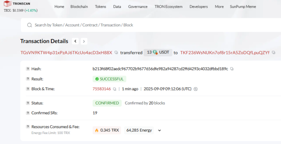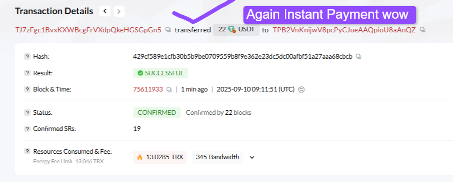 Proof - https://tronscan.org/#/transaction/b213f68f02aedc967702b9677656dfe982a94287cd2ffd4293c4032dfbbd189c